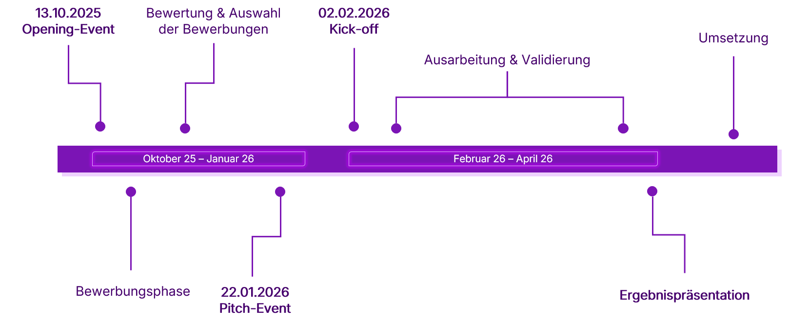 Interessierte Startups und Unternehmen könnensich vom 13.10.2025 bis zum 23.11.2025mit ihrer Co-Creation-Ideebewerbenund die erwarteten Mehrwerte der Zusammenarbeit schildern.Hier geht es zum Bewerbungsformular.